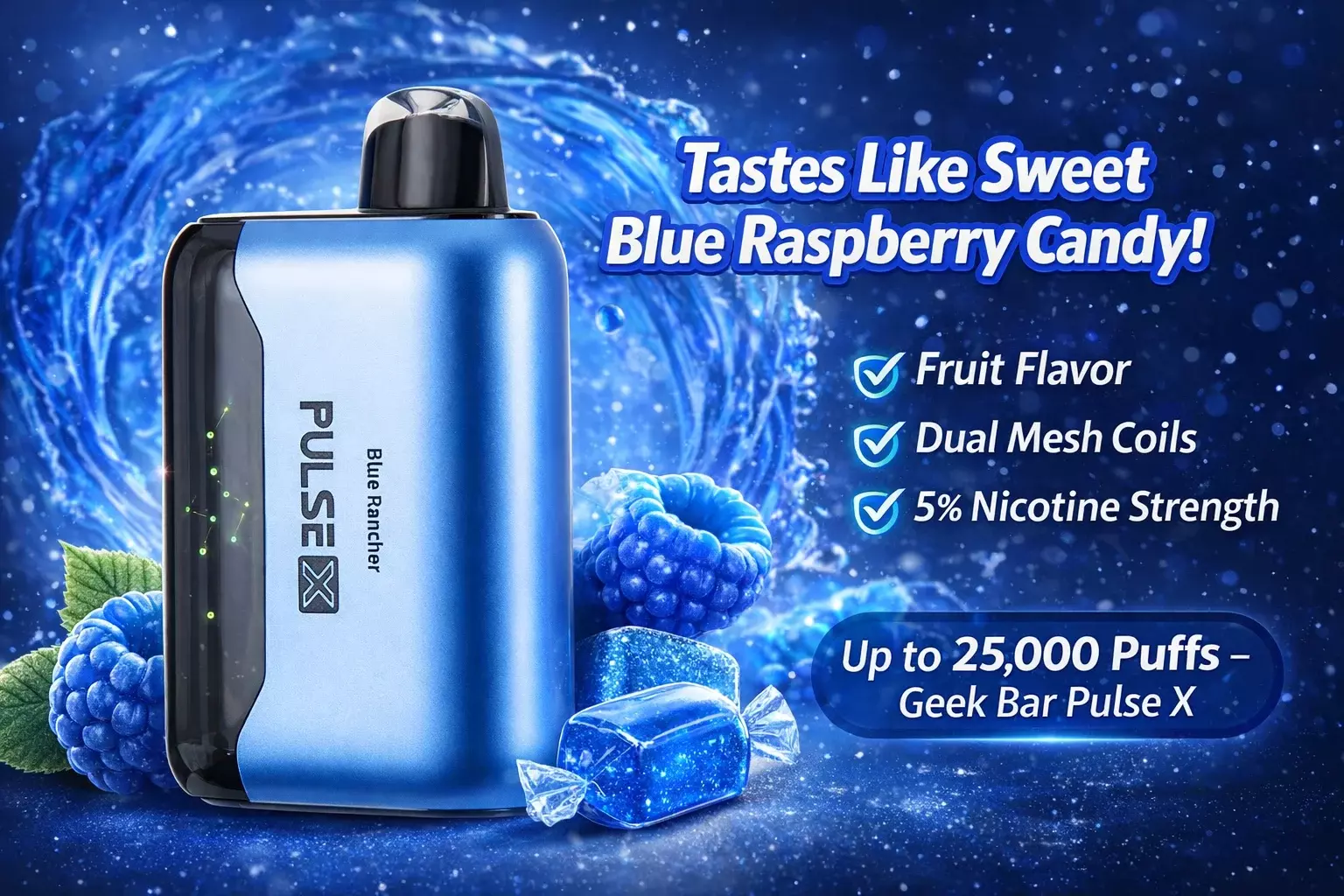 Blue Rancher Geek Bar flavor tastes like a sweet, slightly tart blue raspberry hard candy. It has a bold blue razz profile with a sugary finish that feels familiar from the first puff.