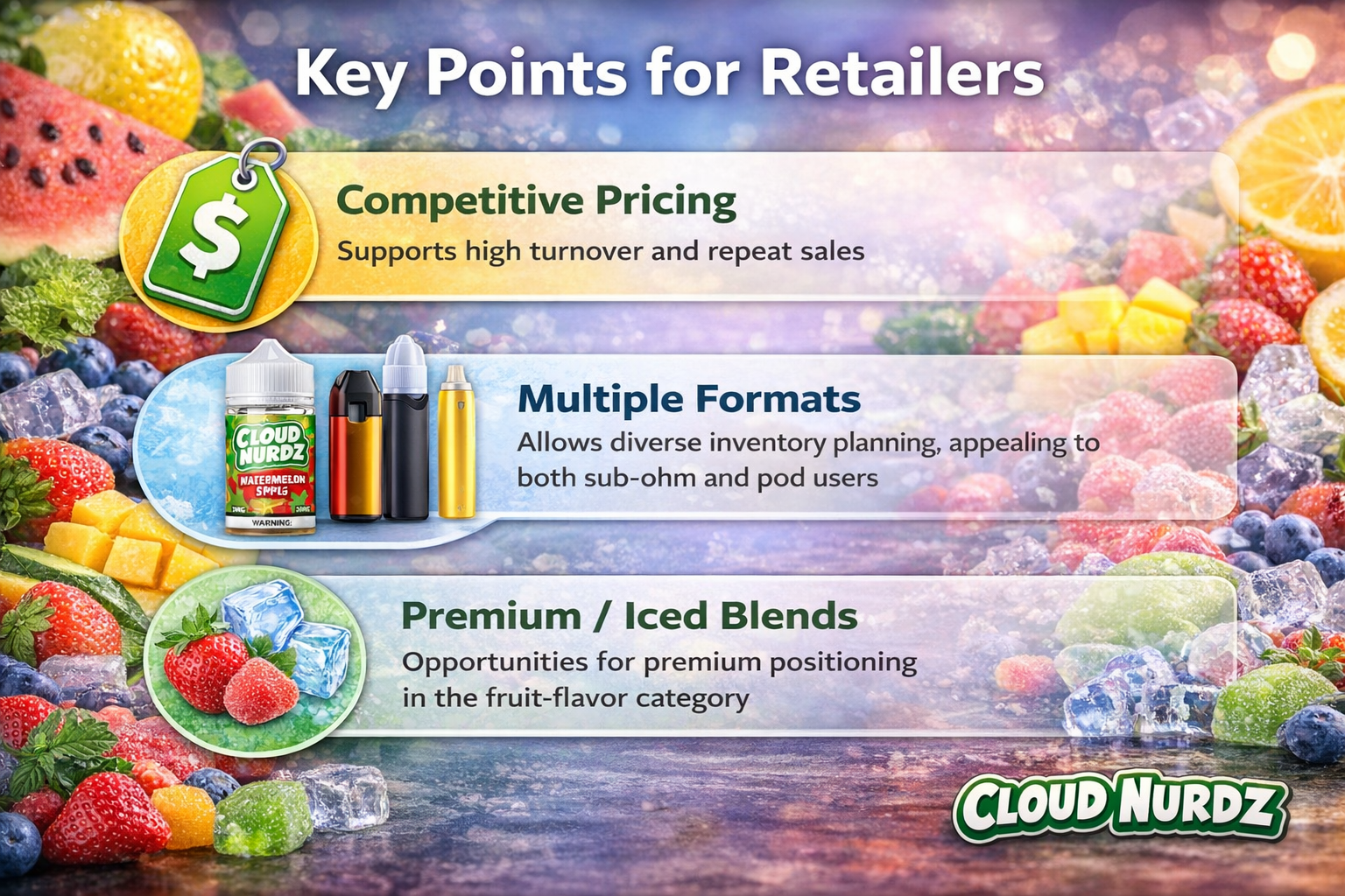 Stocking Cloud Nurdz alongside other fruit-focused brands can help retailers offer variety across device formats and flavor profiles, catering to different customer preferences and purchase habits.