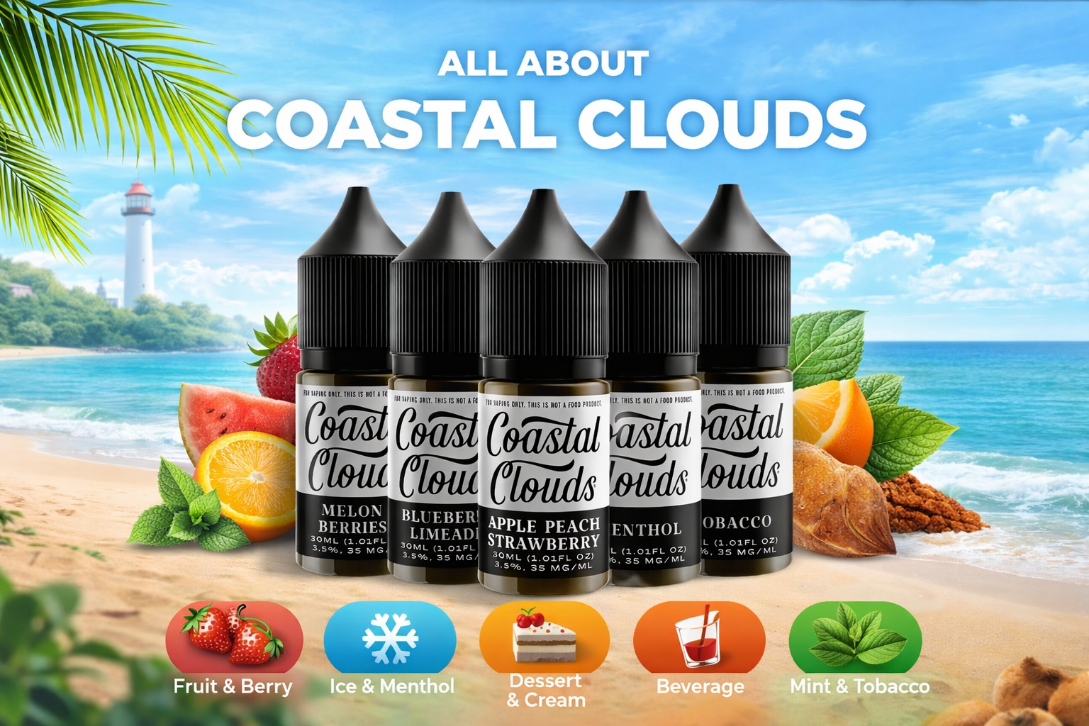 Coastal Clouds is a vape juice brand built around a laid-back coastal theme. It is known for its fruit, dessert, and beverage-inspired blends.