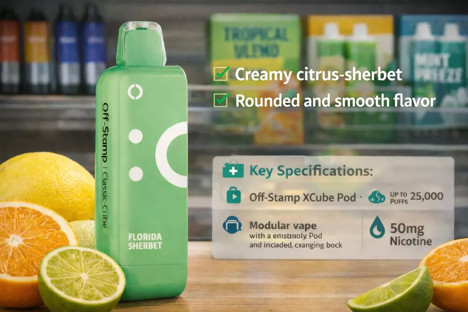 Florida Twist (Off Stamp) | Mixed citrus + creamy sherbet | Off Stamp X-Cube 25K | Up to 25,000 | Adjustable airflow | Smart screen/battery + e-liquid display | 50mg |