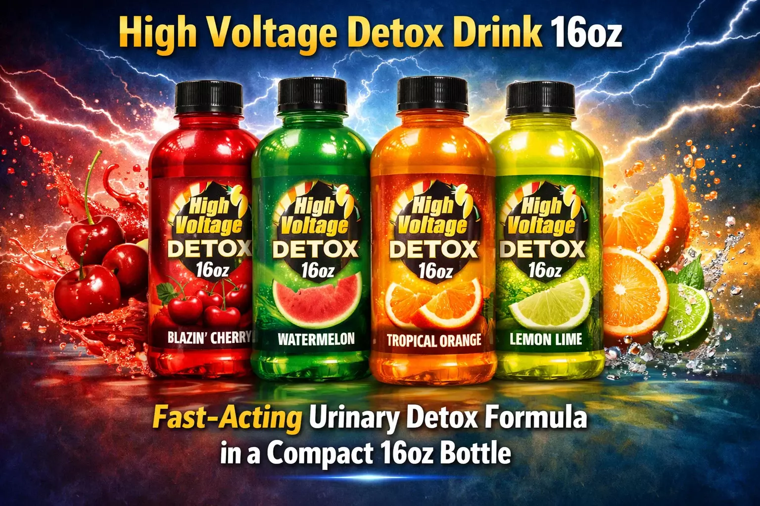 High Voltage Detox Drink 16oz is a ready-to-drink cleansing beverage presented in a compact 16oz bottle. It has been marketed as a fast-acting urinarydetox formula made with ingredients such as vitamin B, creatine, and an herbal blend. It has also been sold in flavors like Blazin’ Cherry, Watermelon, Tropical Orange, and Lemon Lime. This version is often positioned as a convenient option for those buyers who want a portable detox drink format rather than a larger bottle.