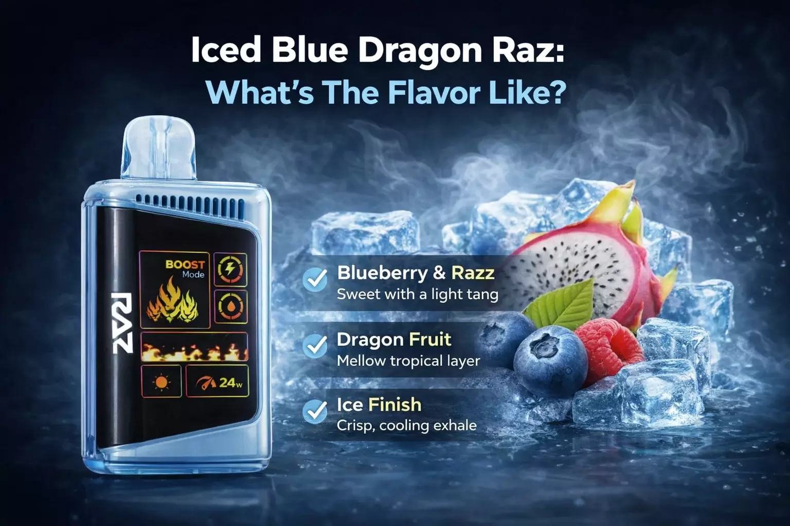 RAZ Iced Blue Dragon flavor has a sweet mixed-fruit profile with a cool menthol finish. Blueberry and RAZz lead the way with a sugary, slightly tangy taste, while dragon fruit adds a smoother tropical note that gives the blend a more distinct character.