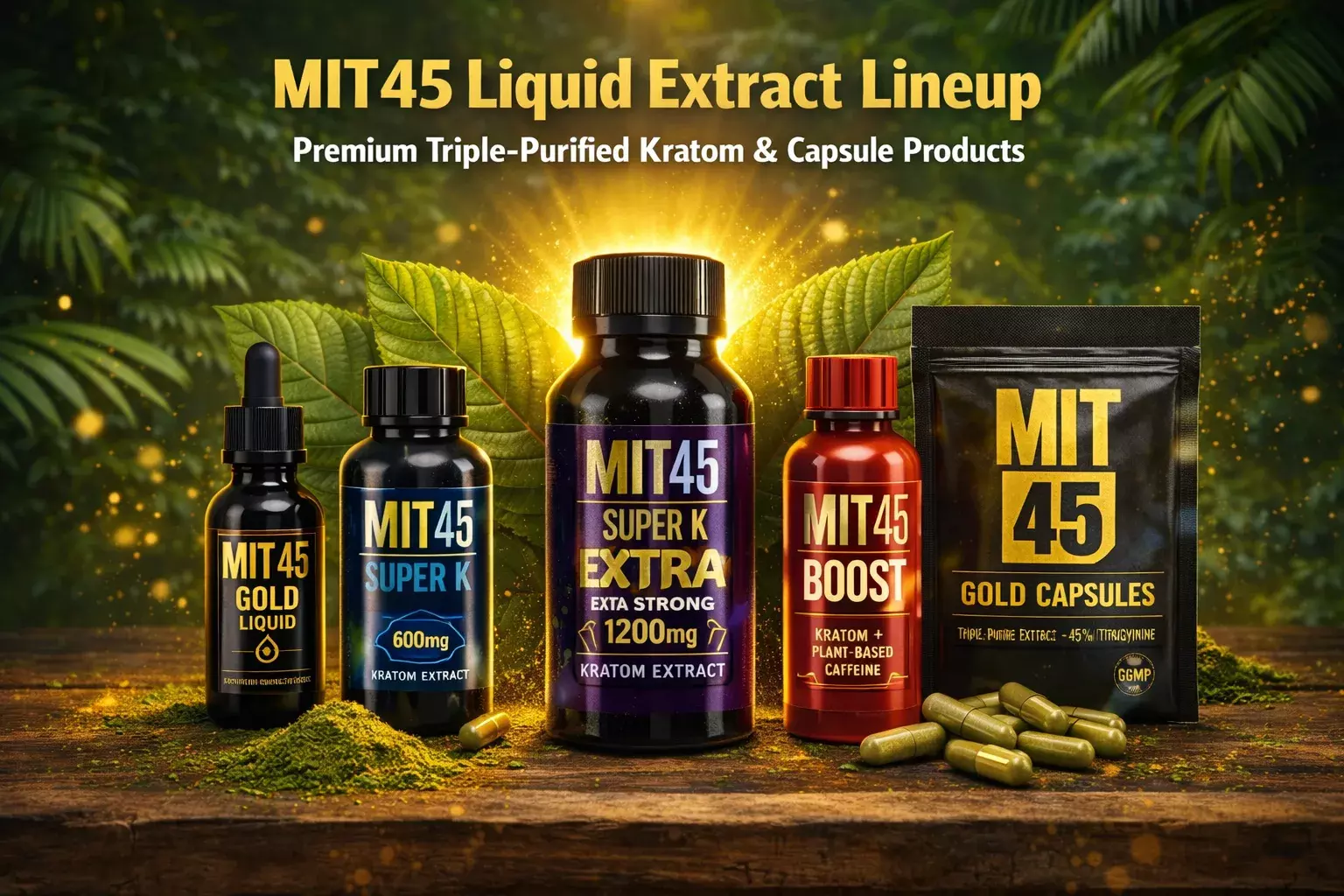 MIT45 Gold Capsules: These MIT45 Gold capsules feature a triple-purified extract standardized to 45% mitragynine, blended with selected botanicals. Packed in a CGMP-compliant blister format, they offer a measured, travel-ready option intended to deliver a strength comparable to the brand’s flagship Gold liquid shots.