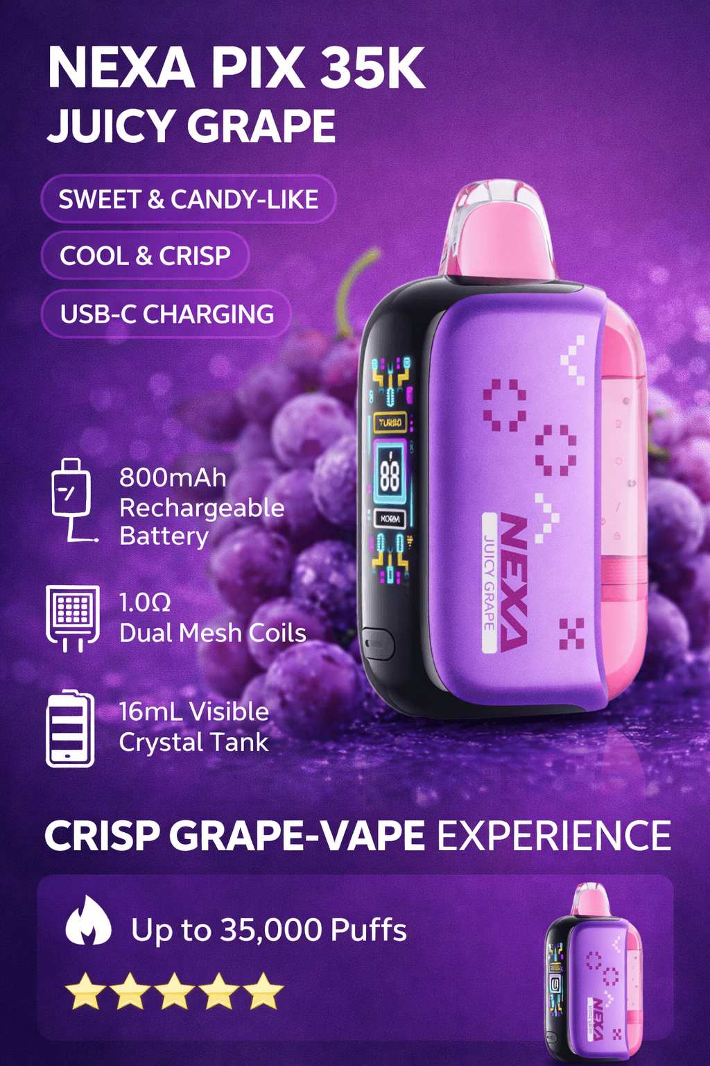 NEXA Vape Juicy Grape is a candy-styleflavorthatdelivers a bold purple grape taste, with a sweet, juicy finish. The flavor stays direct and recognizable, making it a strong pick for anyone who prefers a prominent grape profile without extra layers.