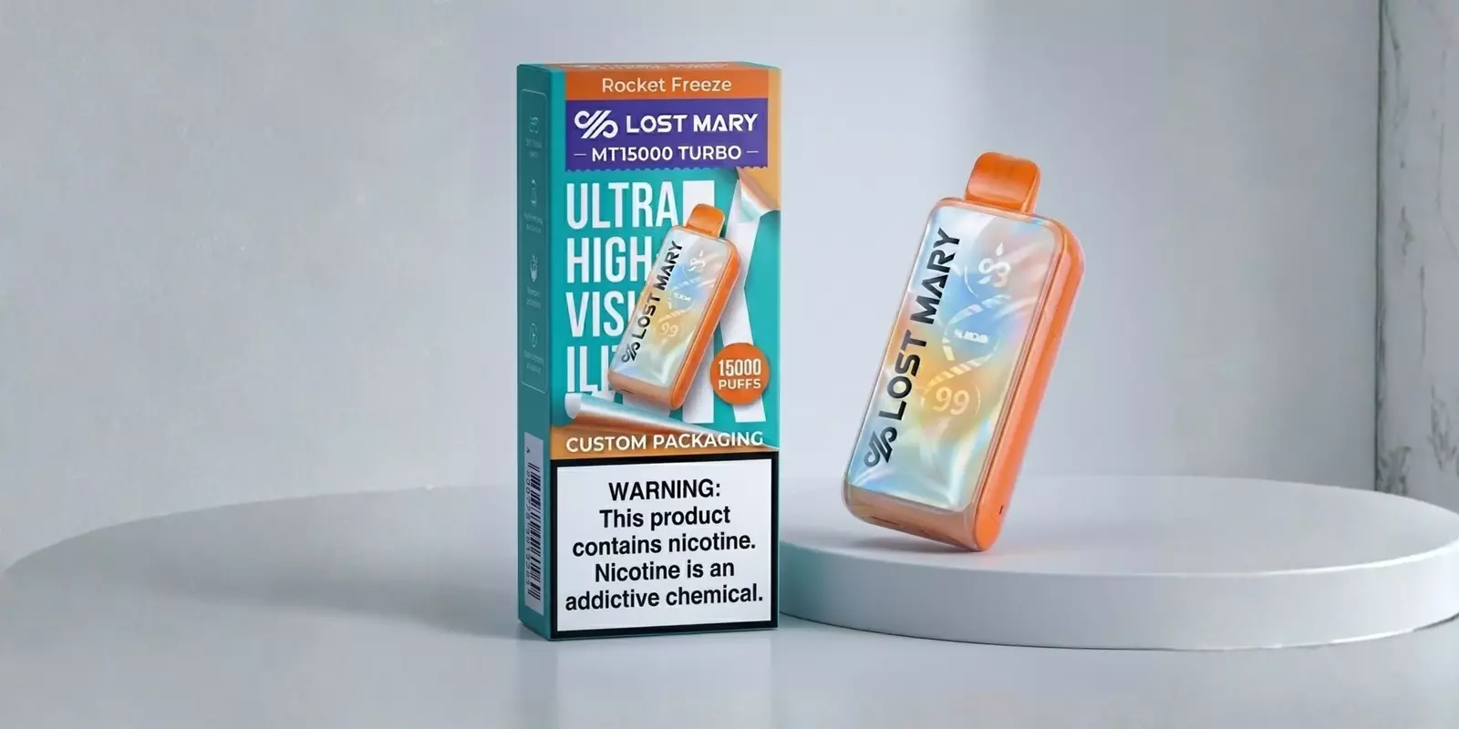 The Rocket Freeze flavor is available in the Lost Mary MT35K Turbo and the Lost Mary Nera 70K model.