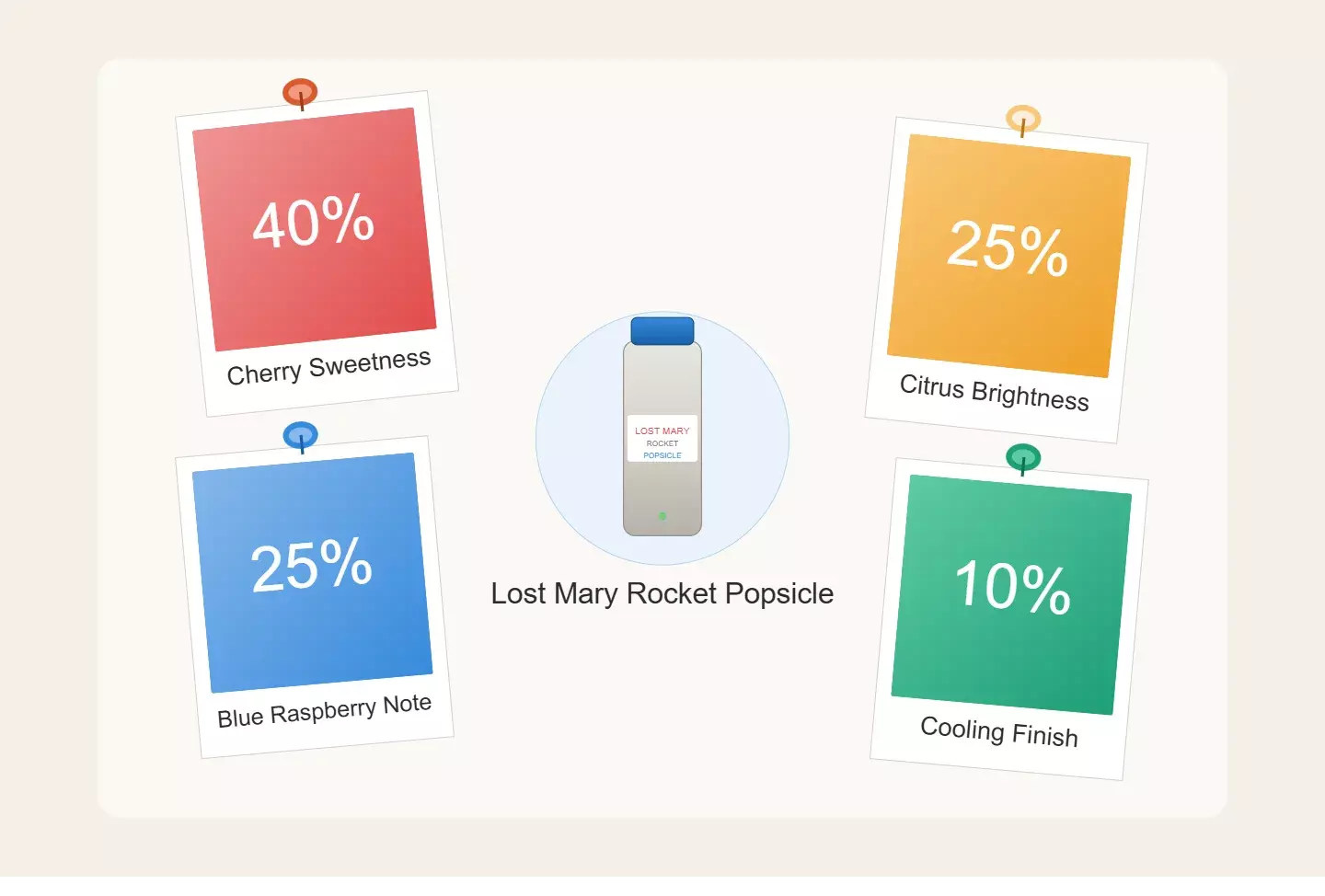 The flavor has enough sweetness to feel like a rocket popsicle, but it does not turn too sugary, and the cooling stays light instead of taking over. Refer to the visual snapshot below for a quick look at the flavor profile.