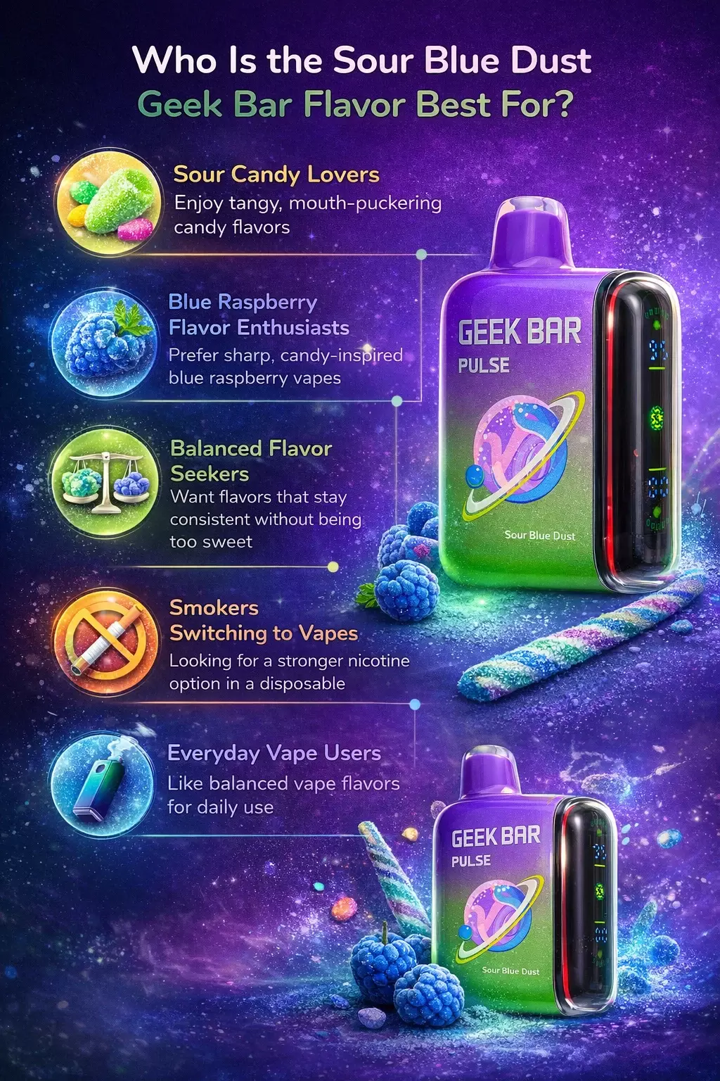 The Geek Bar Sour Blue Dust flavor tends to appeal to vapers who prefer bright, candy-style fruit profiles with a vibrant tang. Here’s a quick look at who may enjoy this flavor the most: