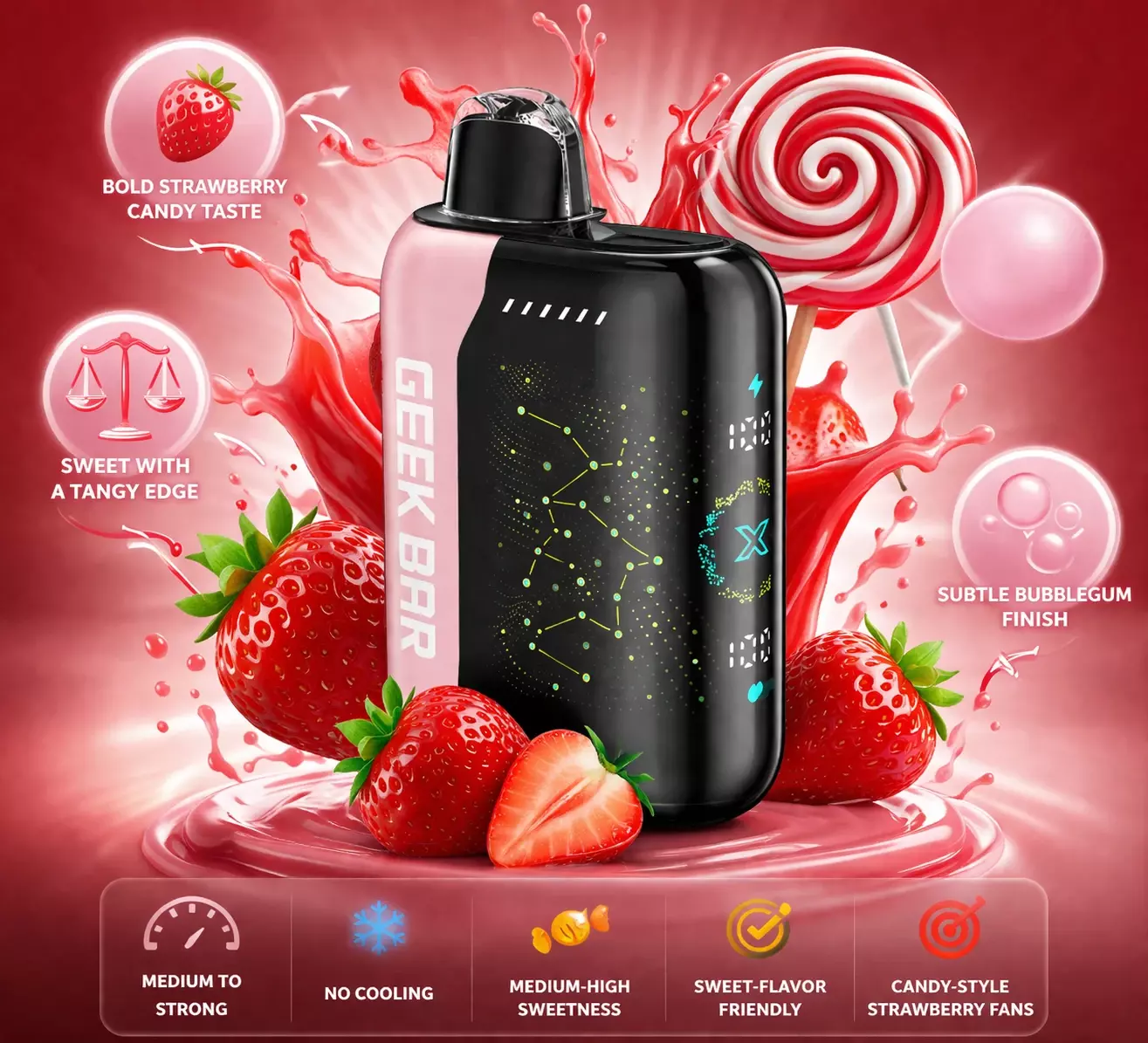 The Strawberry B-Pop flavor comes in the Geek Bar Pulse X device. It pairs its nostalgic strawberry-candy profile with a feature-rich setup, giving vapers a clearer idea of what lies behind the flavor delivery.