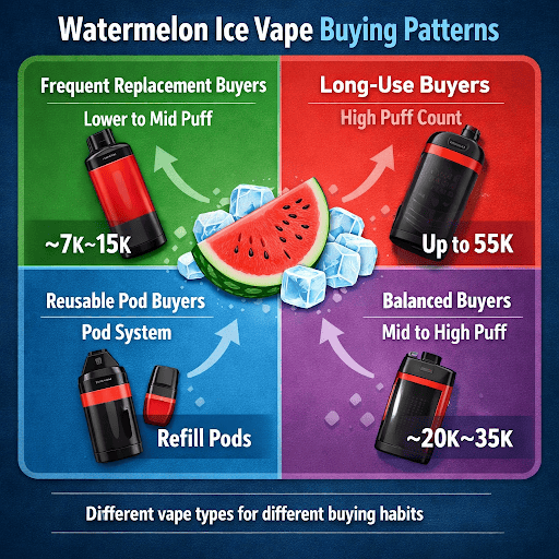 Nearly half of vape users, about 48.8% gravitate toward ice flavors. This steady preference is one of the main reasons Watermelon Ice remains a reliable option for wholesale orders.