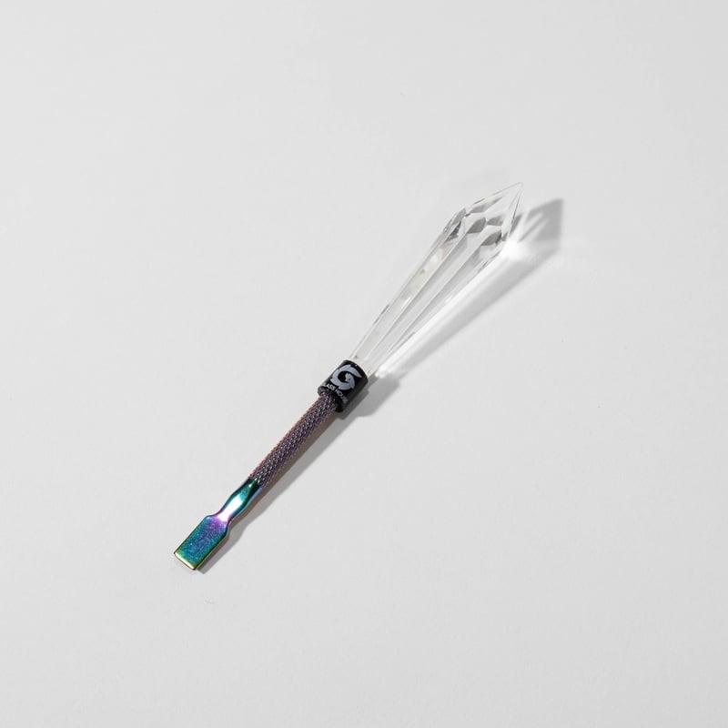Clear crystal shaped, flat head dab tool, with reflective metal.