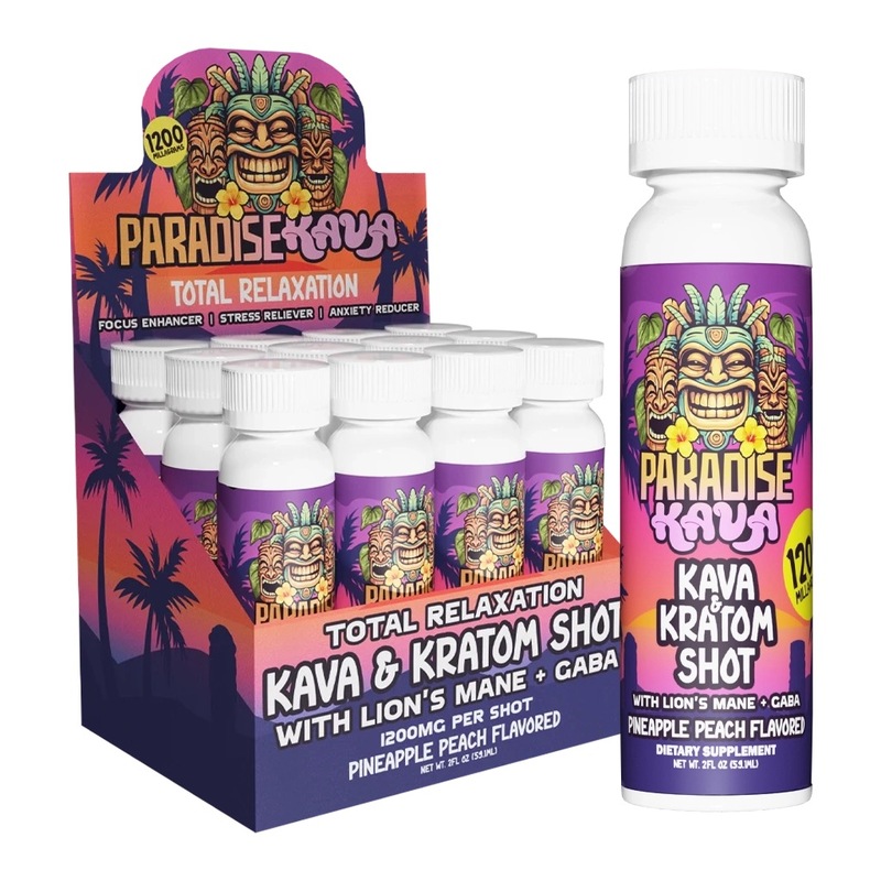 Paradise Kava Shot 1200mg (12ct) is a 2 fl oz functional shot that combines 1200mg per bottle with a formula featuring Kava, Kratom, Lionβs Mane, and GABA. Packed in a 12-bottle display box, it offers a compact format that works well for wellness counters and other fast-turn retail setups. Its grab-and-go bottle style, strong point of strength, and 2 available flavors make it an easy product to place within a broader functional shot selection.